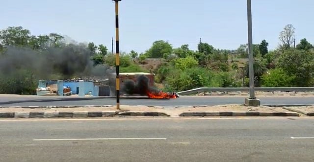 दतिया \ नेशनल हाईवे 44 हडा पहाड़ के पास मोटरसाइकिल में अचानक आग लग गई मोटरसाइकिल सवार गाड़ी छोड़कर भागा। भीषण गर्मी के कारण ऐसी घटनाएं लगातार देखी जा रही हैं मोटरसाइकिल में आग लगने के कारण हाईवे पर लगा जाम प्रत्यक्षदर्शियों की माने तो हाईवे पर एक मोटरसाइकिल चालक चला जा रहा था अचानक हडा पहाड़ के समीप उसकी मोटरसाइकिल में से धुआं निकला और आग लग गई। इस आगजनी में मोटरसाइकिल सवार सुरक्षित है लेकिन उसकी मोटरसाइकिल पूरी तरह जलकर खाक हो गई।